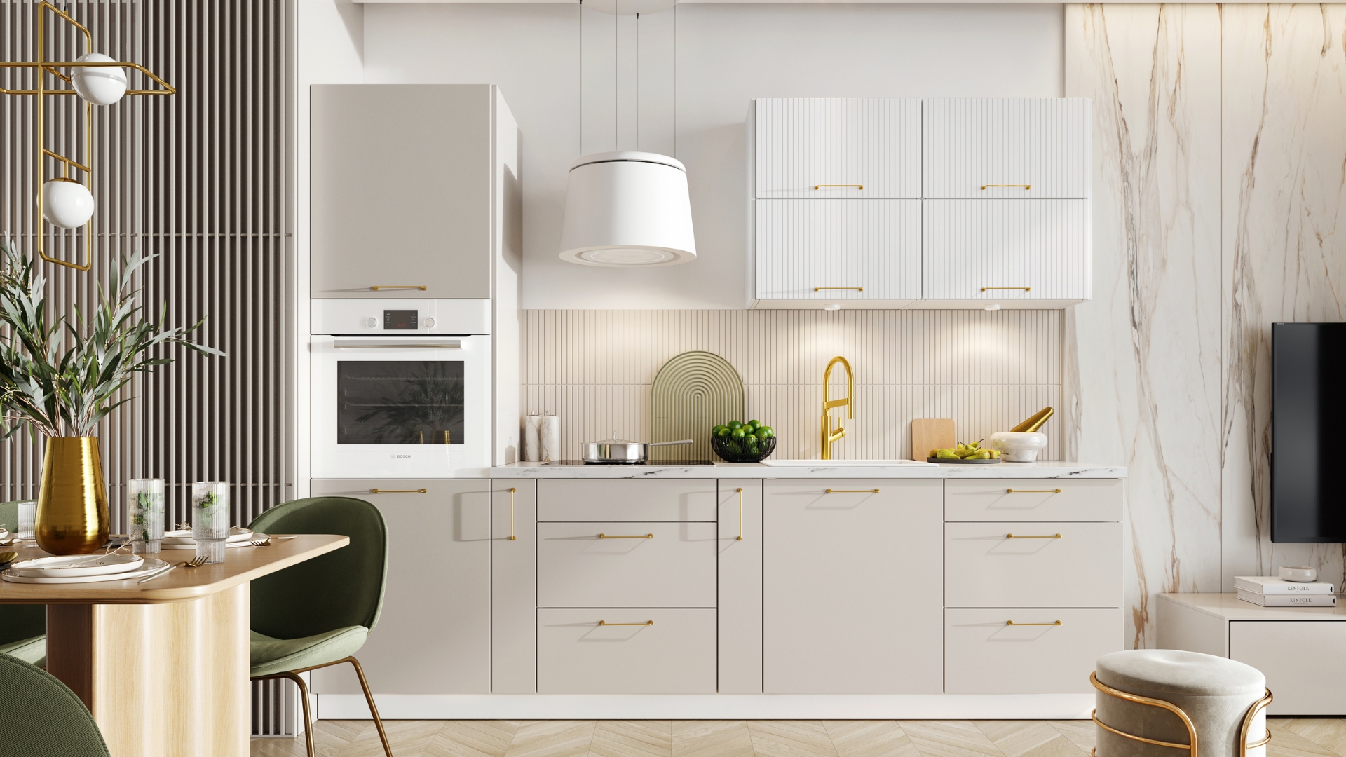 Kate to inspirowana stylistyką retro kuchnia o subtelnie ryflowanych frontach, wykonanych z foliowanej płyty MDF o grubości 16mm. Delikatne frezy interesująco urozmaicają jednobarwne powierzchnie. Fronty dostępne są w stonowanej, matowej kolorystyce. To propozycja dla tych, którzy pragną połączyć wyrafinowaną estetykę retro z funkcjonalnością i nowoczesnym stylem, tworząc kuchnię pełną charakteru i wyjątkowego uroku.